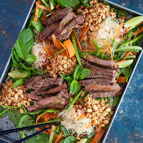 En lättlagad och fräsch nudelsallad med smaker av ingefära, lime, soja och chiliflakes som toppas med skivad entrecote och jordnötter. Underbart gott!