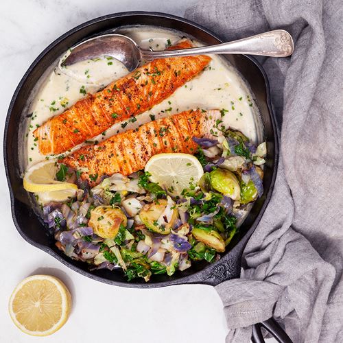 God laxrätt som serveras med en smakrik parmesansås och grönsaker. Färdigt på 30 minuter! Tips; tina fryst lax i kylen över natten. Näringsvärde: 483 kcal, 34 g protein, 33 g fett, 11 g kolhydrater