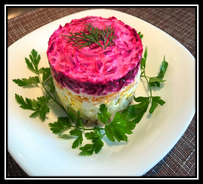 Första lager potatis, andra lager sill och lök. sedan morötter och rödbetor.